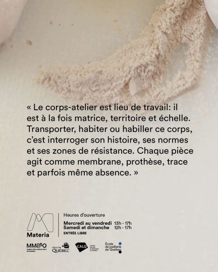Stéphanie Letarte, Emily Lewis, Katia Martel, Laura Sasseville et Anne-Sophie Vallée, cinq femmes artistes issues du milieu du bijou contemporain, déploient des pratiques multidisciplinaires distinctes qui se rejoignent par un désir de faire valoir la recherche et le processus de création avec en son centre, la positionnalité du corps. L’espace devient ainsi laboratoire où la matière pense, où l’excès est productif, où chaque pièce est à la fois œuvre et processus.