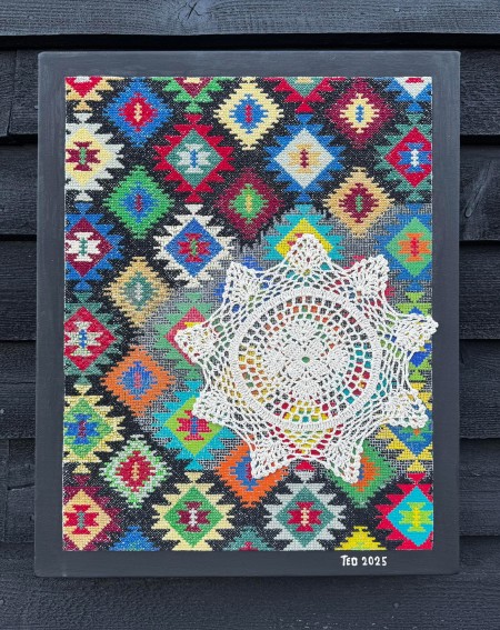 The motifs of the embroidery patterns often feature natural elements like flowers and leaves, as well as geometric shapes and abstract patterns. In my more recent pieces, I have experimented with combining traditional Romanian embroidery designs with other traditional elements - typically mosaics and architectural elements. By doing so, I am able to bridge the gap between traditional designs and the new media formats such as apparel, canvas and burlap to create art that feels fresh and exciting.
