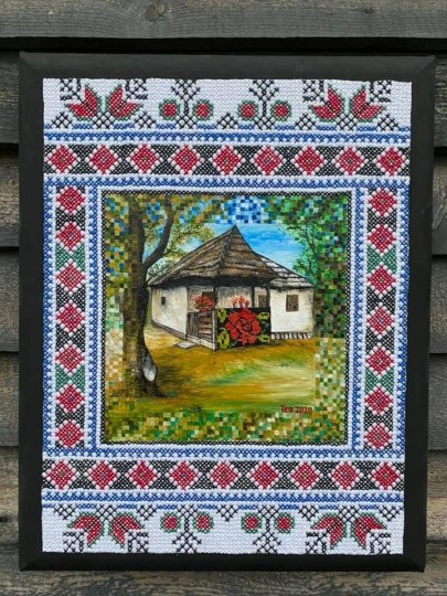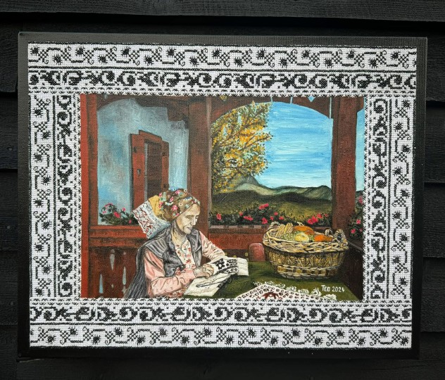 One of my favorite techniques is to incorporate Romanian embroidery patterns into my paintings. These designs are typically created with colorful threads on textiles and have been passed down from generation to generation.