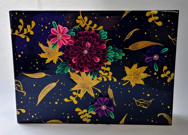 I am a craftsperson specializing in tsumami kanzashi - the Japanese art of folding squares of silk into floral hair accessories. I am currently exploring the combination of wall oriented canvases and removable kanzashi, as well as mixing traditional and modern motifs and crafting materials.