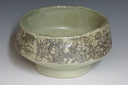A love of detail and drawing are the major influences on my new work, which focuses on using texture and line. For texture impressions on clay, stamps and rollers can be made from bisqued clay or by carving a lino block tile. I create my designs on paper, transfer it and carve the tile. The stamp can be used many times and in different ways. Drawings can also be developed further on the computer, such as reversing and duplicating the image. The tile is laid on the soft clay and rolled with a rolling pin, with firm pressure, to make the impression. I first used this process on small bowls and continued developing it for use on larger vases and art pieces.