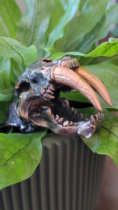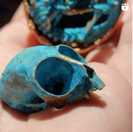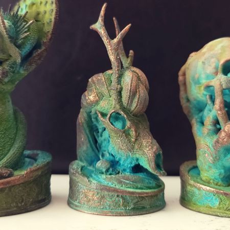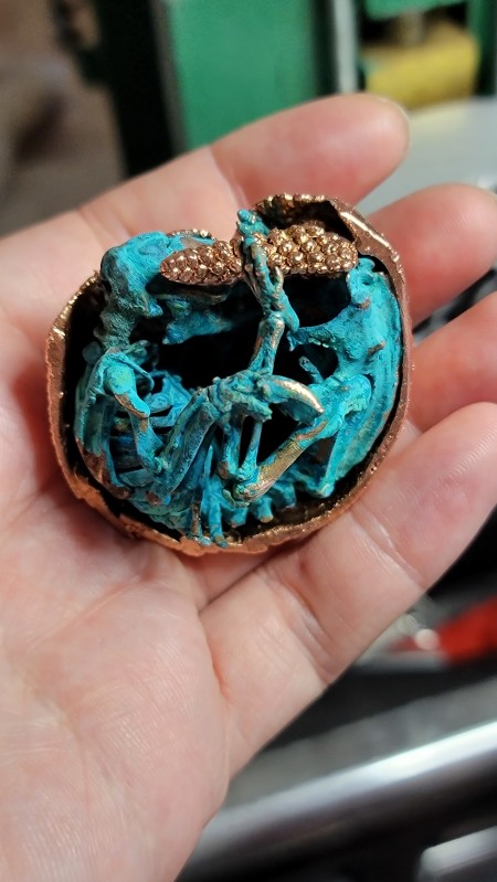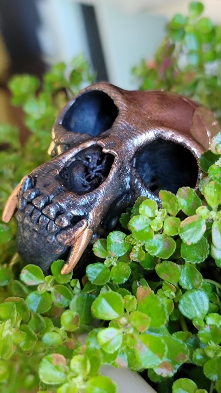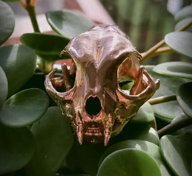 I make metal treasures, currently skull replicas from pendant size to large wall decor. I also make metal insects, animals, dieties and love making chess sets. My prefered metal is copper, but I also work with silver and 24k gold etc. I think more than anything, I most passionate about the process.