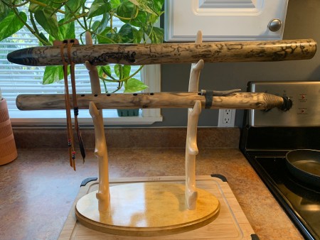 His personal journey to understand his heritage, is done in art. He blends traditional ways of making art and regalia with contemporary tools. His art is produced both by hand and using traditional tools, computers, and modern tools such as laser cutters. He first started by building Traditional Native North American 5-hole flutes. All his flutes are made of branches harvested locally. He then started making jewelry, earrings, chokers, necklaces and bolo ties. Using both traditional tools, materials and computer aided tools to carve in wood, reclaimed wood, leather, bone and other traditional materials