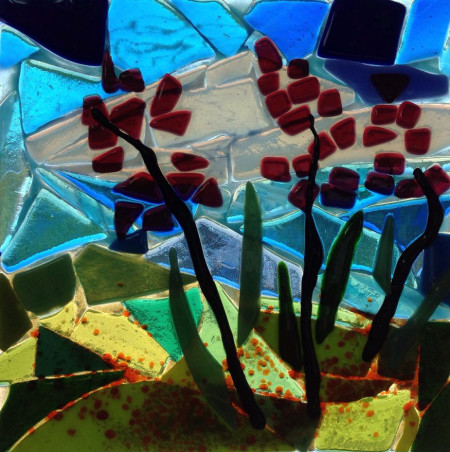 As a result of her explorations, she incorporates warm glass techniques in her window panels to provide surface design that is free of the leaded lines of stained glass work. Painting, casting, kiln forming and lampworking glass are the new challenges as equipment and technical developments allow for more creativity in the field.