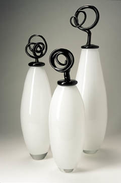 After first studying glass blowing in 1996 at the Alberta College of Art and Design (ACAD), she has continued her studies through travels to Scotland, the United States, Spain, France and Hungary where she acquired a knowledge of design and traditional European glass making techniques. She completed her course work at ACAD in 2000 and now owns and operates Firebrand Glass Studio with her husband, Tyler Rock.