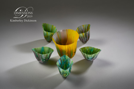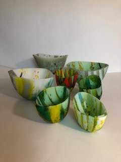 Kimberley started as a interested fan of glass art style and blossomed into a true fused artist. Kimberley gets her inspiration from the simple beauty of the world around her and her endless picture taking in her garden & colors of the changing seasons. I'm fascinated with designing layers of glass, at times I push the limit with my kiln but I always love to put my twist on my creation being a vessel, plate, bowl or decorative art.