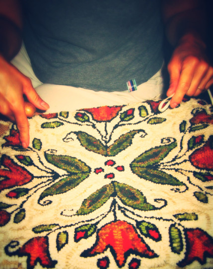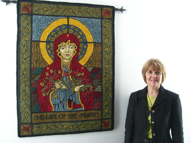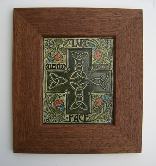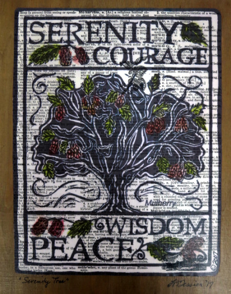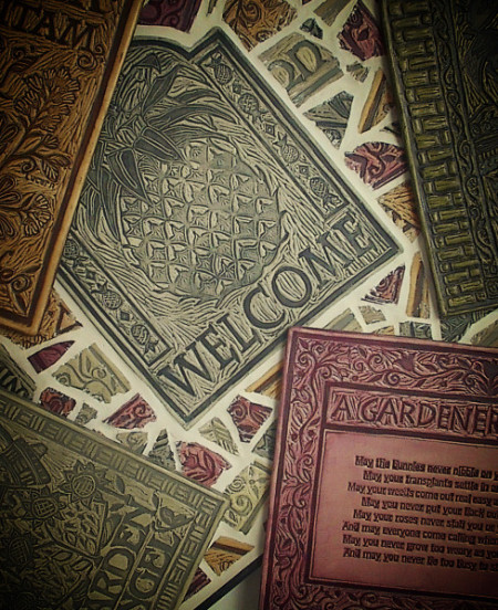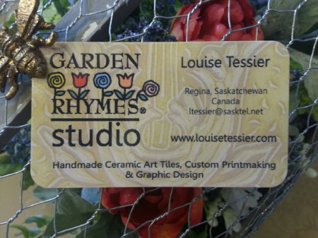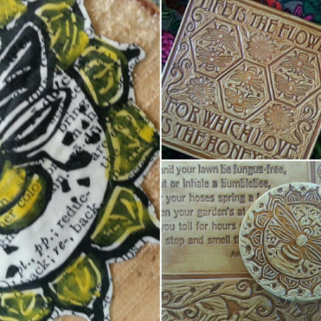 In my home studio, I create ceramic art tiles in the folk art style (Garden Rhymes® Studio). My work, which originates from hand-carved linoleum stamps, is colorful, textural, detailed and thought-provoking with messages that touch the heart. I also find joy working in mosaics, printmaking, rug hooking, book illustration, collaborations with other artists and writing religious icons.
