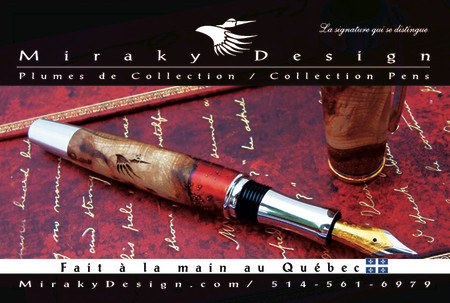 Miraky Design has been developing hand made distinctive pen for the last 7 years. After more than 15 years of design in the fashion industries, the designer Marie-Josée Francoeur had reoriented herself to produce an exclusive & really artistic Collection of writing instruments for the real pen connoisseur. Miraky Design, high-end collectible art pen & fountain pens are, the best personalized corporate gift pen for your company. Made of wood or hand painted resin, each unique model is engrave of a serial number and has one year warranty. Made of precious materiel like titanium, rhodium or 22 k gold plated. Miraky Design the distinctive signature. Interior design. New product since spring 2011, a new series of painting have been developed, made of resin & different techniques, a must for the modern space or for the interior designer. In 2012 she started doing jewlery