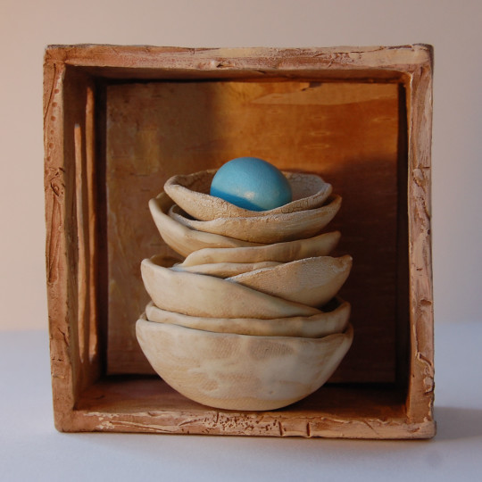 "My work is a bit varied. I have no loyalties to any particular discipline and enjoy discovering and working with different mediums - although clay, encaustic paint, found objects and materials are definitely old friends. At the moment, the exploration of multiples, space and patterns are the focus of most of my creative efforts."