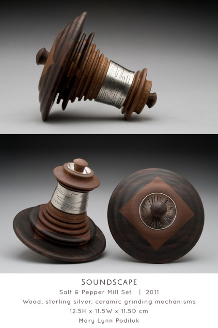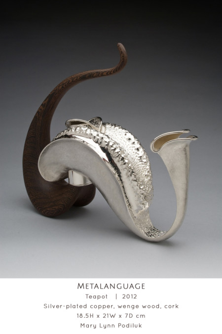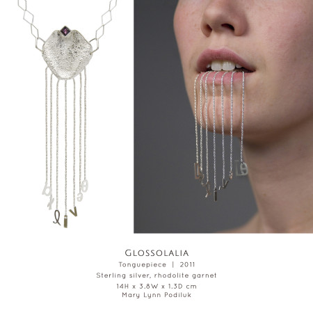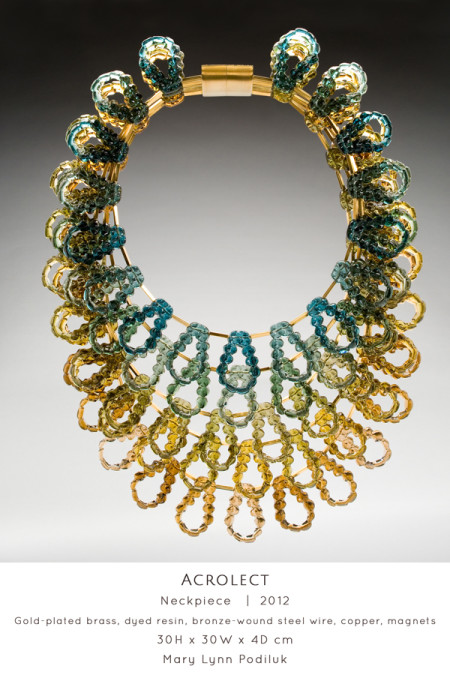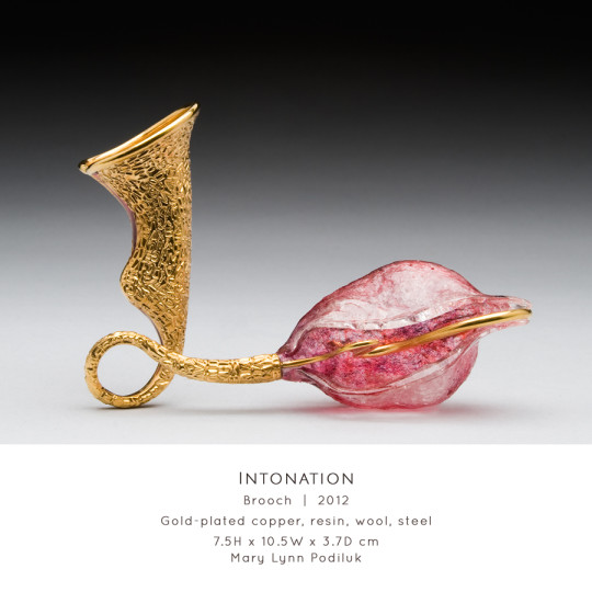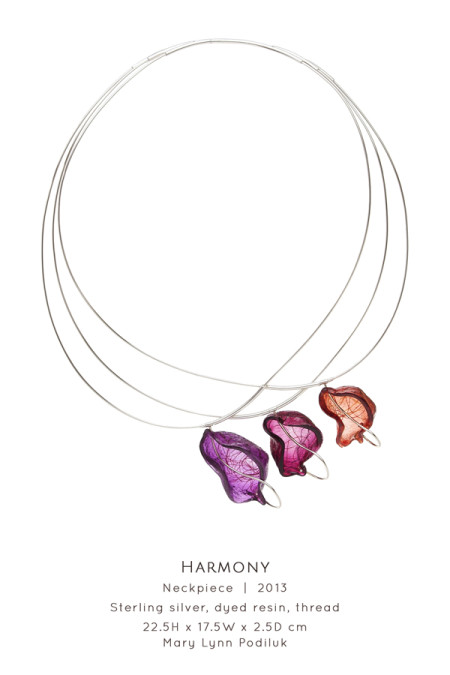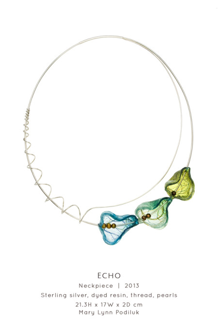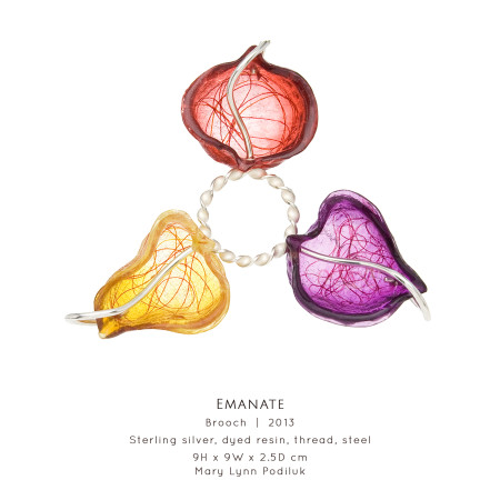 Viewing natural objects through perspectives of speech and sound, Saskatoon-based Art Jeweller & Goldsmith Mary Lynn Podiluk explores the relationship between communication and artistic interpretation. She represents aspects of language through organic forms, linguistic textures and acoustic visualizations creating conceptual jewellery and holloware that is sensual and graceful. Mary Lynn builds on a foundation of traditional goldsmithing and enamelling using alternative techniques adapted and refined through continuous self-directed experimentation. Blending precious metals, gemstones and resilient yet glass-like resin, she creates an interplay of light and colour between lustrous surfaces and vibrant transparency, resulting in sculptural, expressive work that speaks to the viewer, whether on the body or on display.