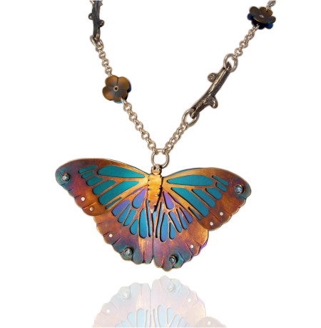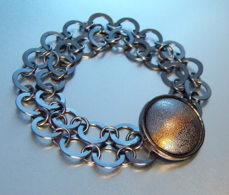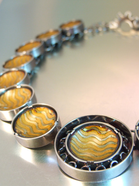 Melody Armstrong is an internationally recognized contemporary jewellery artist based in Regina, Saskatchewan. She earned a BFA, majoring in Jewellery and Metals from the Alberta College of Art and Design, graduating with Distinction in 1999. Creating with a variety of metals, enamels and stones, Armstrong’s Industrial-Organic aesthetic combines abstraction with a truth to materials that reflects both her attention to detail and quality of workmanship. Armstrong delights with her use of contrasts in surface treatments to highlight the elements she has imposed throughout the metal. Vitreous Enamel, anodized metals, or gemstones creates bursts of colour and reflection while the patina oxidizes much of the metallic surfaces, providing a sense of distress, corrosion and age.