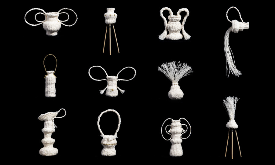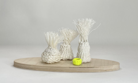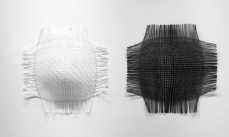 Le besoin incessant de manier les fibres — sur mon métier à tisser ou pas — donne lieu à un travail méticuleux qui engendre au final des sculptures abstraites. Souvent mises en scène, elles façonnent ainsi un univers insolite qui propose subtilement une incursion à la fois dans le passé et vers l’avenir.