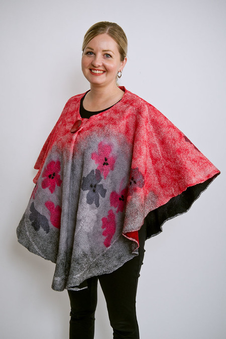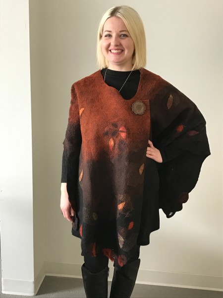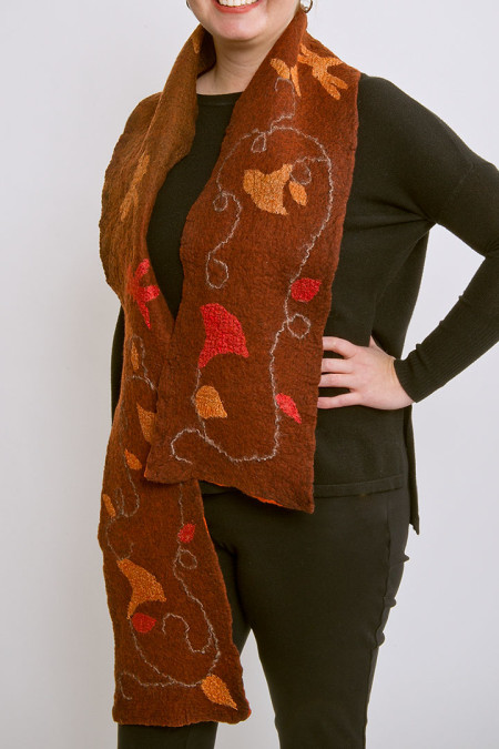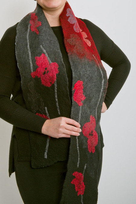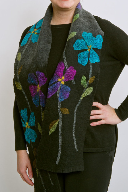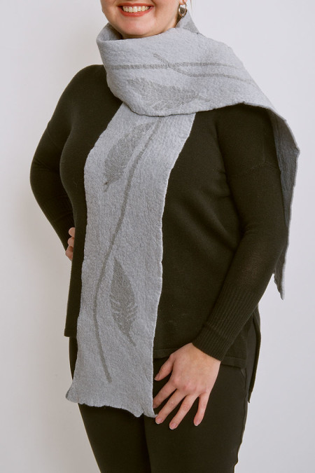 My pieces represent a series of natural motifs using a variety of colourways and a continuously evolving exploration of surface designs. Each piece is created using a nuno felt technique...through the hand felting of fine merino wool fibres and delicate layers of silks, resulting in delicate and durable works.