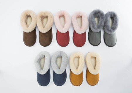 Business partners (and next door neighbours) Alan Eschke and Dinah Woodworth each have over 42 years of experience making sheepskin slippers, mitts and hats for all ages. Assisted by Shelagh McGuinty since 2009, everything is made in Lanark Village by the team of three.