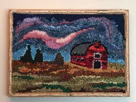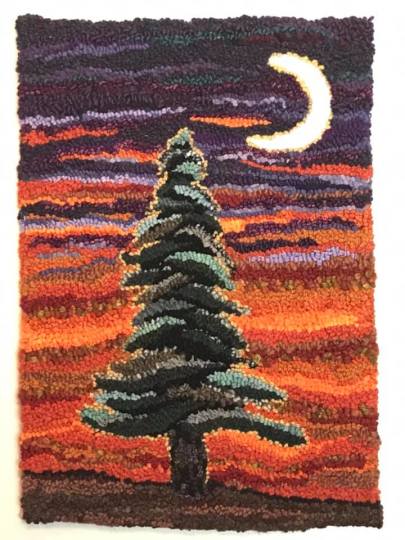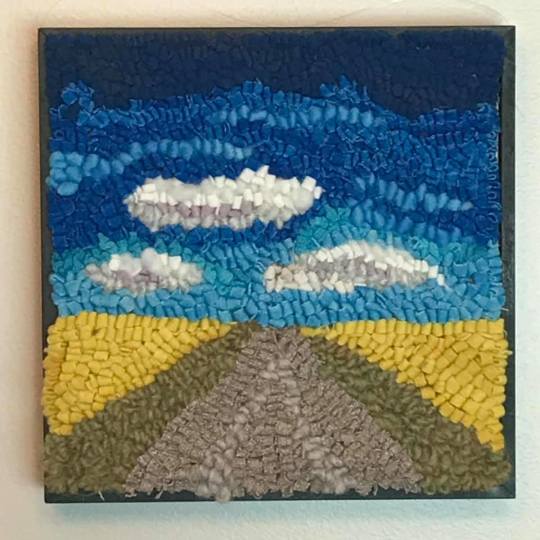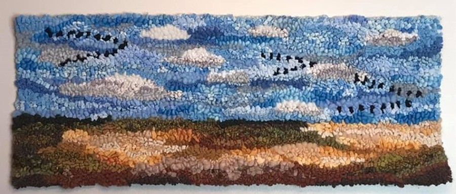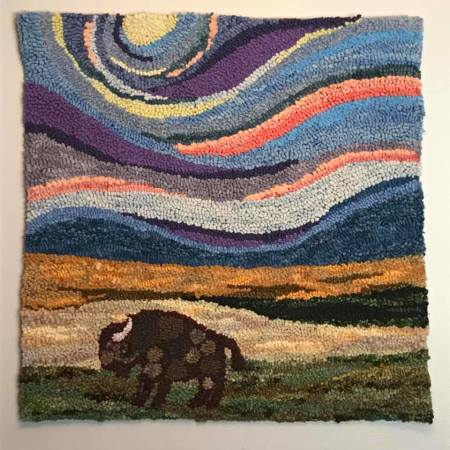 Shelly Nicolle-Phillips currently lives in Regina, Saskatchewan and was born and raised in Prince Edward Island. Shelly taught herself the craft of rug hooking in 2015, inspired by the many rugs that were hooked by her grandmother and the long tradition of hooking in the Maritimes. Her art is a mix of traditional primitive rug hooking designs and more modern pieces including many landscapes. The depth and texture in her work is achieved using a wide variety of colours and textures of mostly wool with other materials such as silk used to accent her designs. Many of her pieces are inspired by the vast, beautiful prairie landscape as well as her birthplace in PEI.